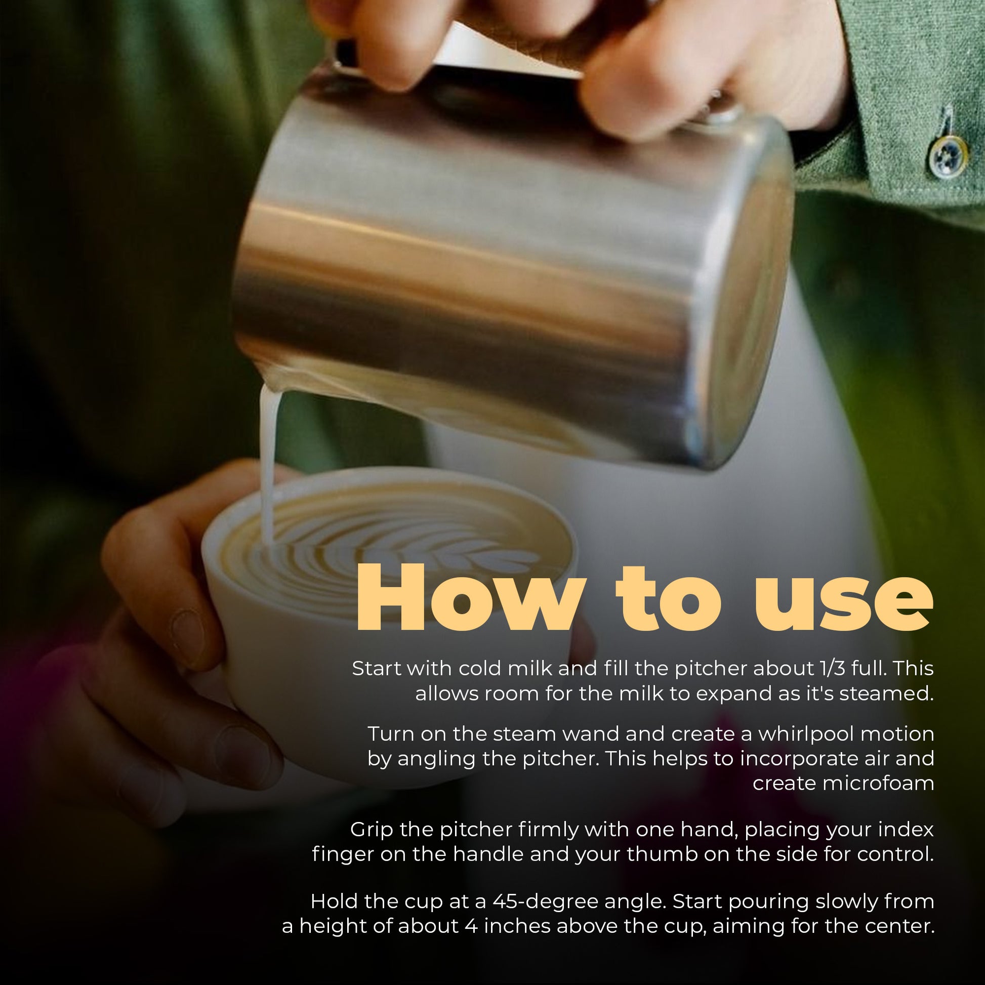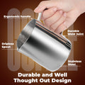 - LARGE COMFORTABLE HANDLE: This latte art pitcher not only looks great but feels great too, thanks to its large ergonomic handle providing optimum comfort and control during use.