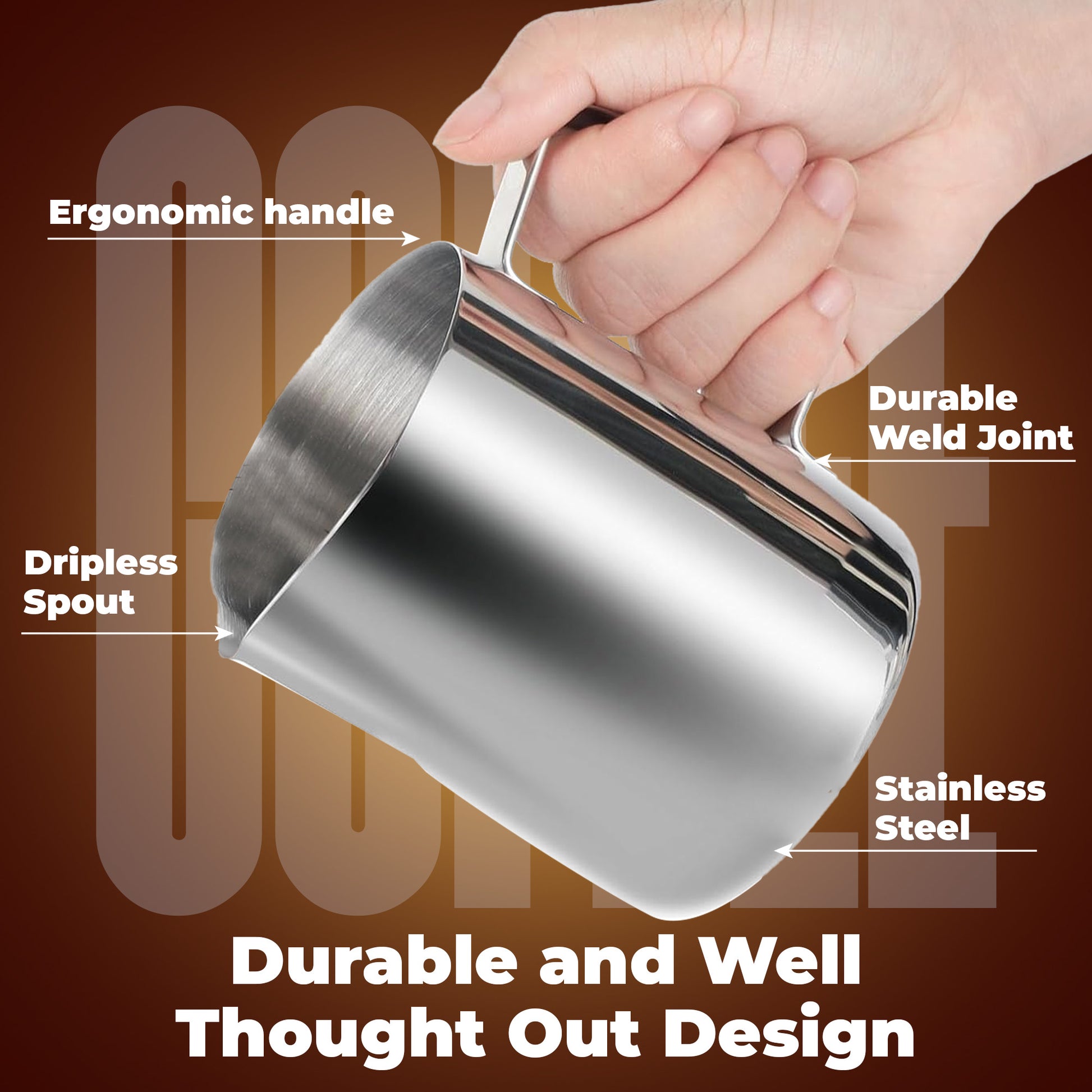- PRECISION DRIP-RESISTANT SPOUT: Our stainless steel latte art pitcher features a drip-resistant pouring spout design, enabling you to pour effortlessly and accurately every time; the tapered spout was specifically crafted for latte art mastery.