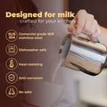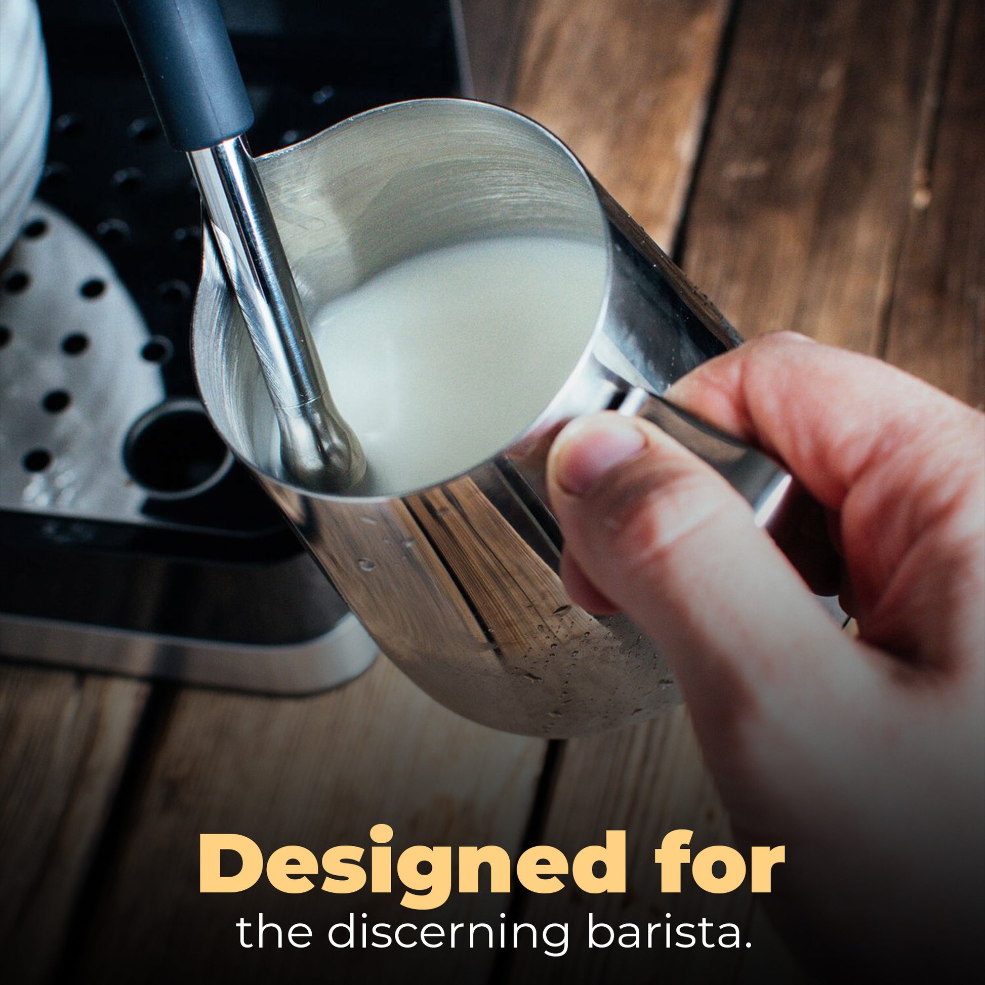 - HIGH-QUALITY STAINLESS STEEL: Elevate your latte art experience with our premium Rattleware Macchiato Milk Frothing Pitcher, crafted from high-quality stainless steel to complement your espresso set and last for years to come.